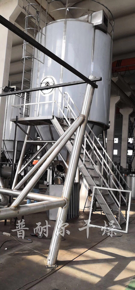 維生素B噴霧干燥機(jī)干燥系統(tǒng)是由熱風(fēng)管道、熱風(fēng)蝸殼、熱風(fēng)分配器、空氣分散器、內(nèi)塔體、保溫層、塔體骨架、外塔體、出料管道、觀察清洗門等主要部件組成。從換熱器出來的潔凈空氣通過熱風(fēng)管道進(jìn)入熱風(fēng)蝸殼,經(jīng)熱風(fēng)分配器均布后進(jìn)入干燥塔,熱風(fēng)分配器可根據(jù)物料的特性來調(diào)節(jié)旋轉(zhuǎn)角度,控制物料的停留時(shí)間。