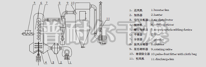 (4)干燥氣流進(jìn)入干燥室底部,產(chǎn)生強(qiáng)烈的旋轉(zhuǎn)氣流,對(duì)器壁上的物料產(chǎn)生強(qiáng)烈的沖刷帶出作用,消除粘壁現(xiàn)象。
