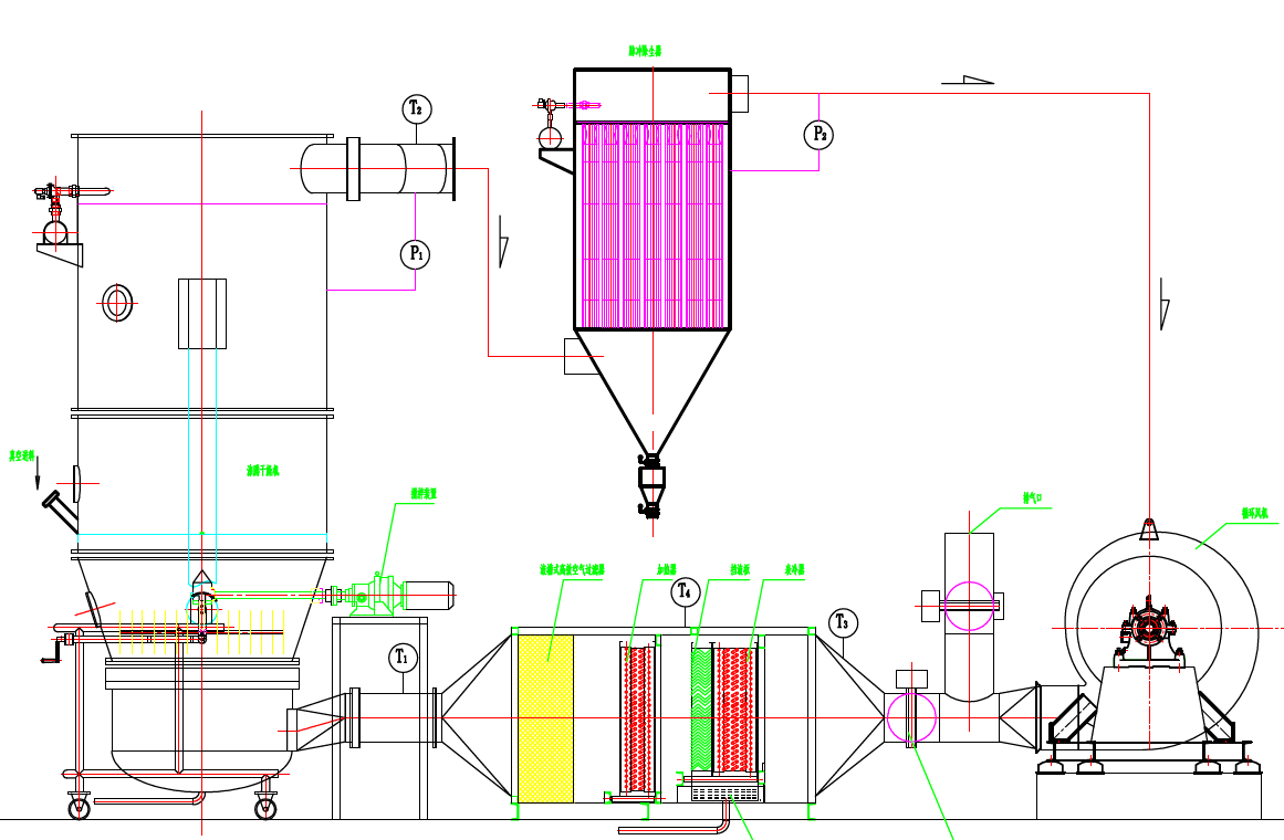 二、干燥:系統(tǒng)充氮后,設(shè)備內(nèi)部的風(fēng)經(jīng)過風(fēng)機(jī)驅(qū)動;進(jìn)入過濾器過濾,加熱器加熱進(jìn)入主機(jī);在主機(jī)的料斗中經(jīng)過大面積的氣固接觸,進(jìn)行傳質(zhì)傳熱的雙相交換(帶走溶媒,留下熱量);隨后進(jìn)入除塵器,細(xì)粉再次被截留;隨后進(jìn)入冷凝器,再次進(jìn)行傳質(zhì)傳熱的雙相交換(帶走熱量,留下溶媒),之后再回到風(fēng)機(jī),實現(xiàn)循環(huán)。干燥時設(shè)備內(nèi)部與外部無任何。